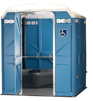 Complies with Americans with Disabilities Act standards. Dimensions are 7'-8' wide x 7'-8' long by 7'-8' high. Constructed of reinforced injection molded plastic. Spring loaded magnetic door closes automatically. Wheelchair accessible with grab bars. Interior space allows wheelchair to turn 360 degrees. Single toilet seat over 50 - 60 gal holding tank containing liquid chemical for breaking down waste. Usually stocked with seat covers, waterless hand sanitizer, and toilet paper. NOTE | Once a sink is placed inside of a 7'-8' ADA restroom, the unit ceases to conform with the American with Disabilities standards. It maintains the status of a handicap - accessible toilet and bathroom. The Freedom 2 unit is manufactured by Satellite Industries - Port O Let Height: 90.75" Width: 77" Depth: 77" Weight: 350 lbs. Optional Tank of 35 gallons is available to meet California Title 24.