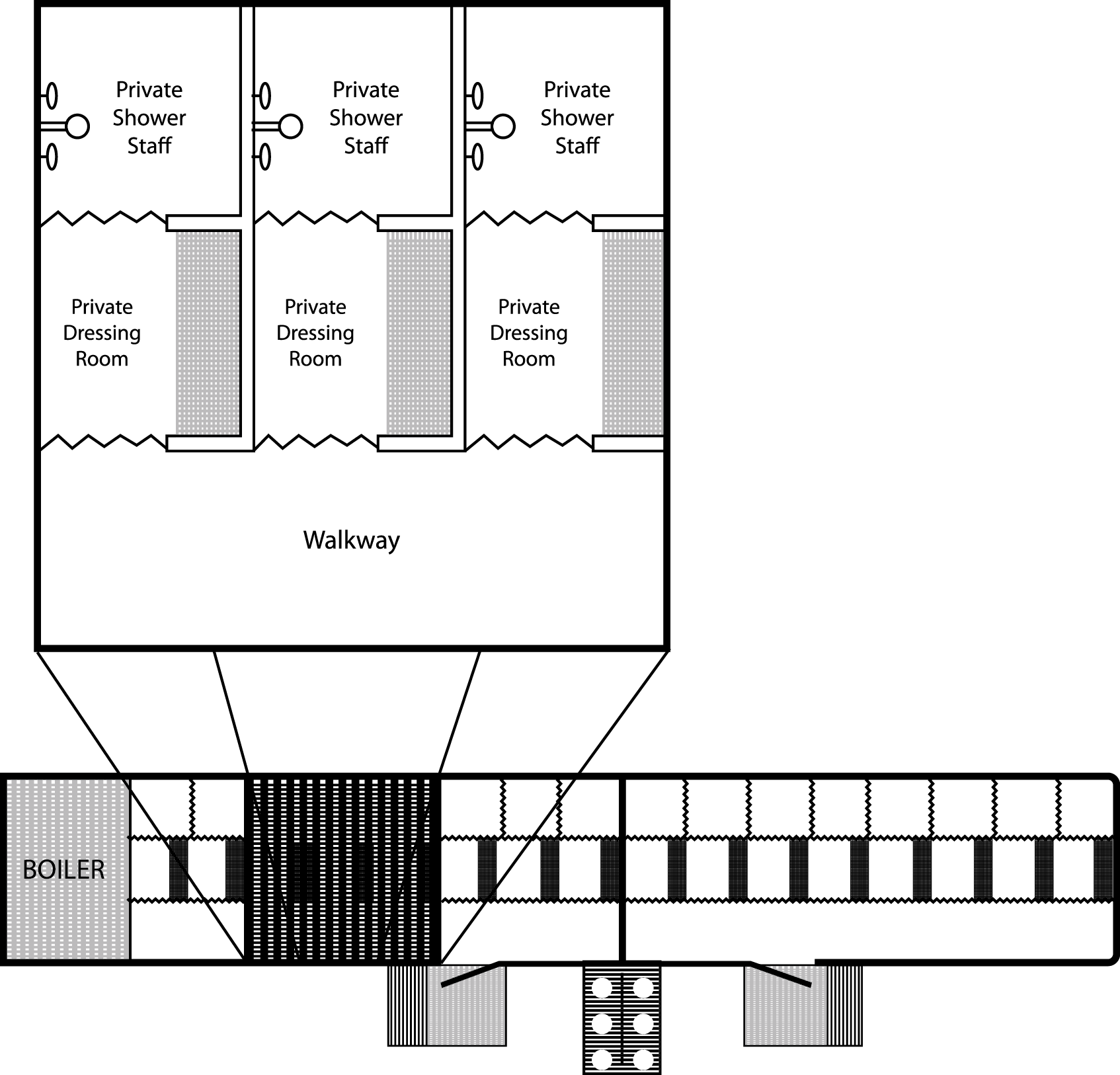 3 Shower Stall, 1 Restroom Stall, 1 Sink