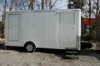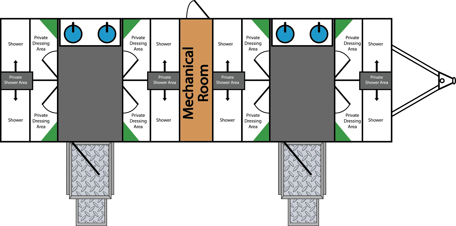 Trailers with 8 private stall showers provide mens and womens separated areas with changing rooms. View the example facility below. This unit is completely self-contained and is operable using 110 volt outlets and can be connected with a spigot and garden hose. Generators and large water tanks are also available if water and power sources are unavailable. These units can be rented daily, weekly, monthly and certain trailers are available for long term rental.